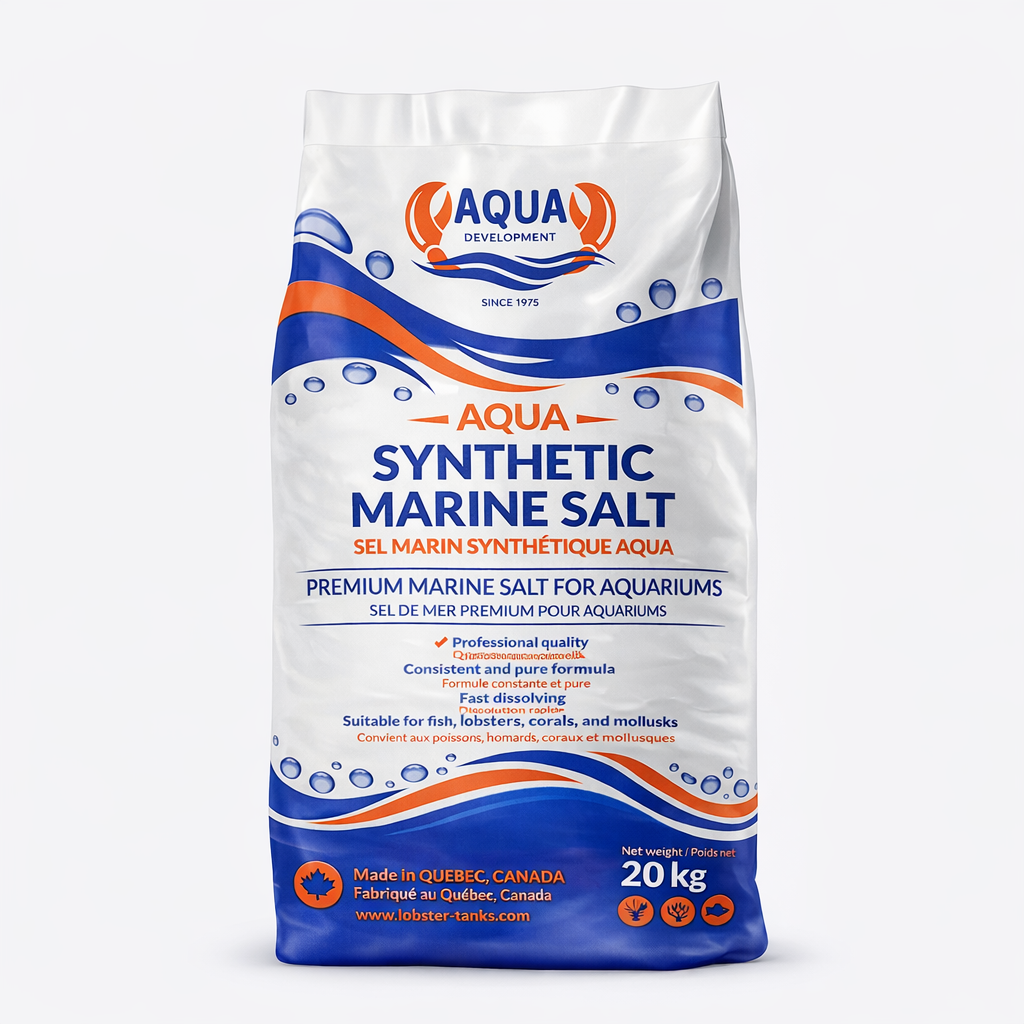 - Superior Water QualityOur sea salt for lobster tanks and aquariums is crafted with a unique formula, developed and manufactured by Développement Aqua Inc., to ensure exceptional water quality. Its optimized composition guarantees clear water enriched with essential nutrients, creating the ideal environment for lobsters, crustaceans, and fish. Offering the best value on the market, our sea salt is the perfect solution to maintain the health and vitality of your aquatic ecosystem.